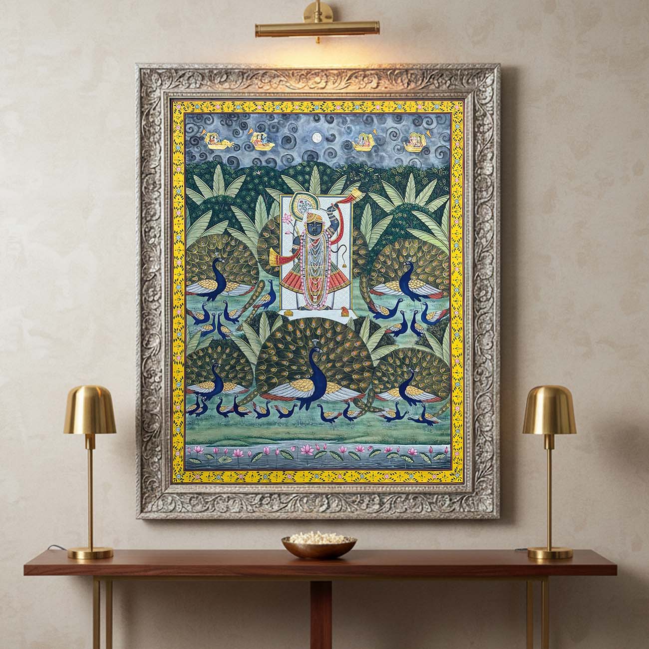 Celebrate Shrinathji’s vibrant Saavan Leela with dancing peacocks in this handcrafted traditional Pichwai – perfect for spiritual and artistic spaces.