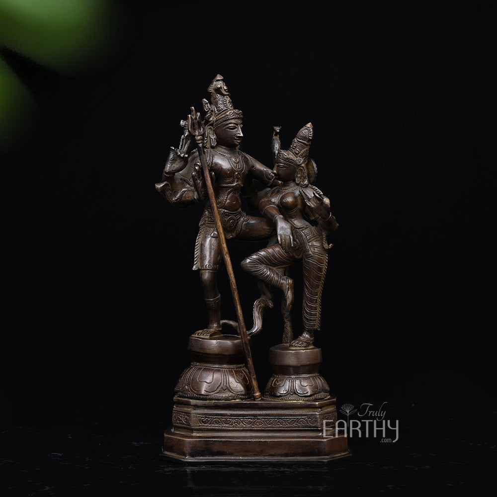 This Dancing Shiva and Parvati duo sculpture embodies the divine harmony of creation and destruction. Handcrafted with a vintage, authentic antique finish, it perfectly captures the sacred balance of life in its most exquisite form.