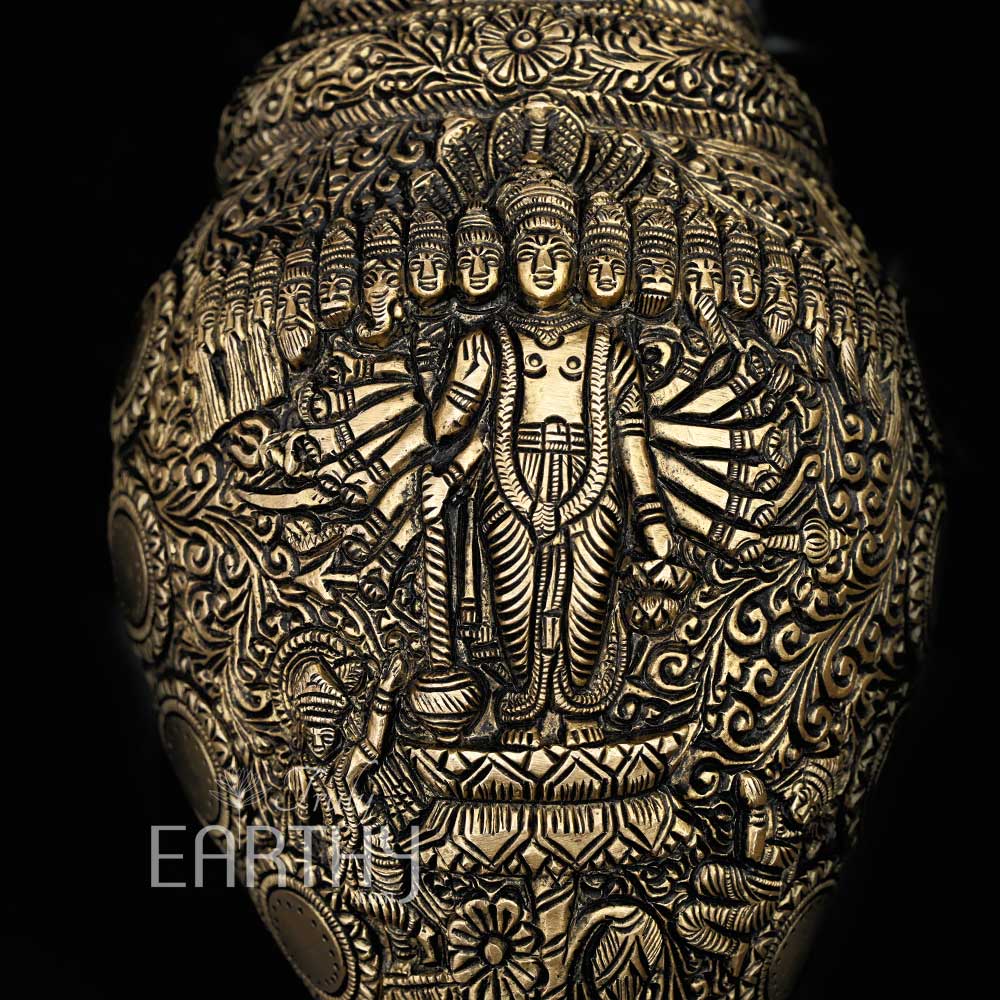 This beautifully handcrafted brass conch (shankh) features an exquisite depiction of Lord Vishnu in his ten incarnations (Dashavatara).