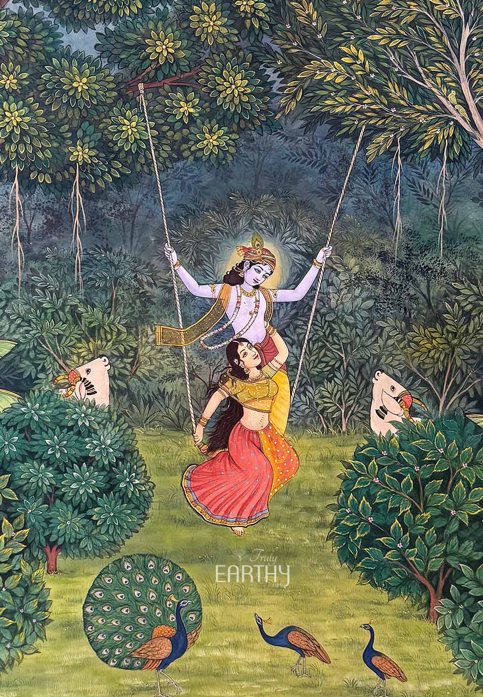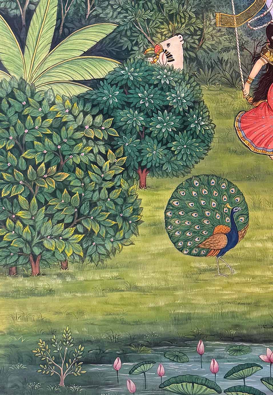 Swing of Divine Love is a handmade Pichwai painting that captures a tender moment of divine romance set in a lush, blooming grove. The composition shows a graceful couple on a swing beneath flowering trees, surrounded by peacocks, lotus blooms, and rich greenery—symbols of love, devotion, and harmony with nature.
