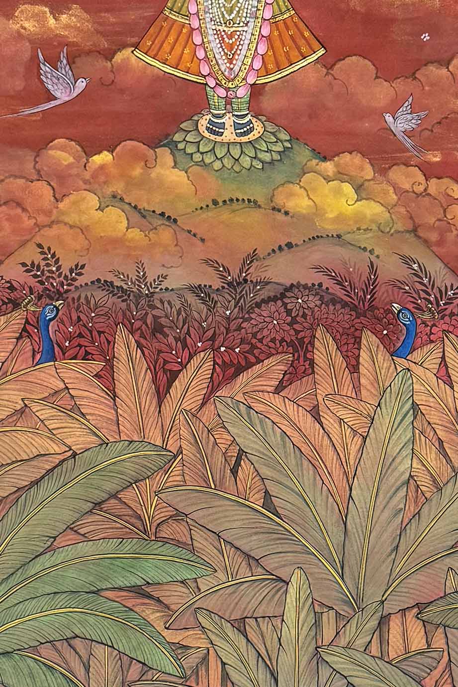 This handcrafted Pichwai painting captures the divine presence of Shrinathji blessing the forest with vitality, while devoted cows look on in reverence and celestial beings shower flowers from above.