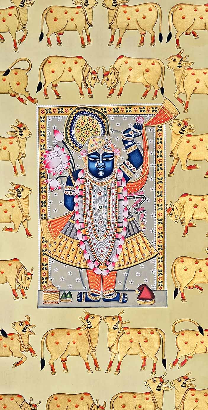 Buy this antique-finished Pichwai painting featuring Shrinathji and cows.
