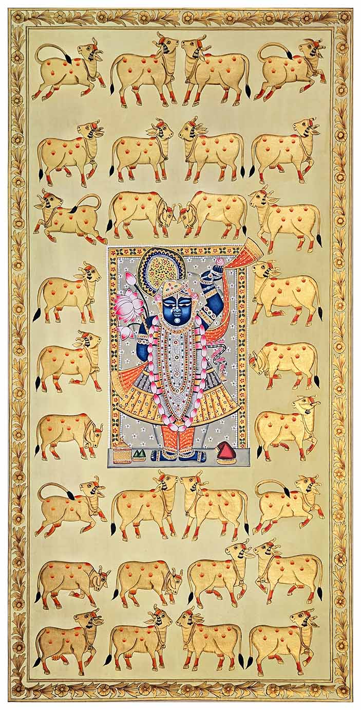Shrinathji & Cows - Handmade Pichwai Painting (Unframed / 60.9 x 121.9 cm)